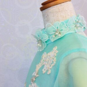 透け感のある生地に、花のモチーフをあしらったレースやパールを丁寧に縫い留め、襟元には可憐なフラワーモチーフを連ねています。