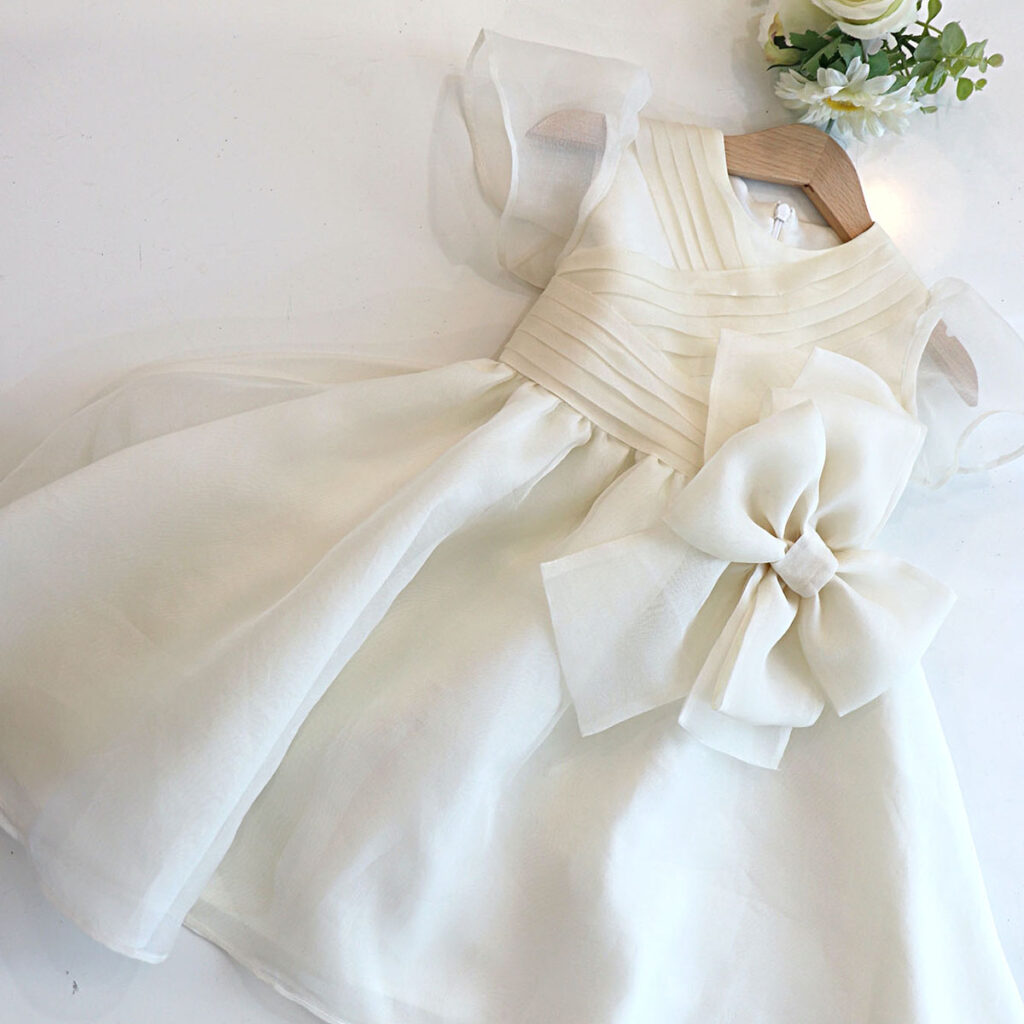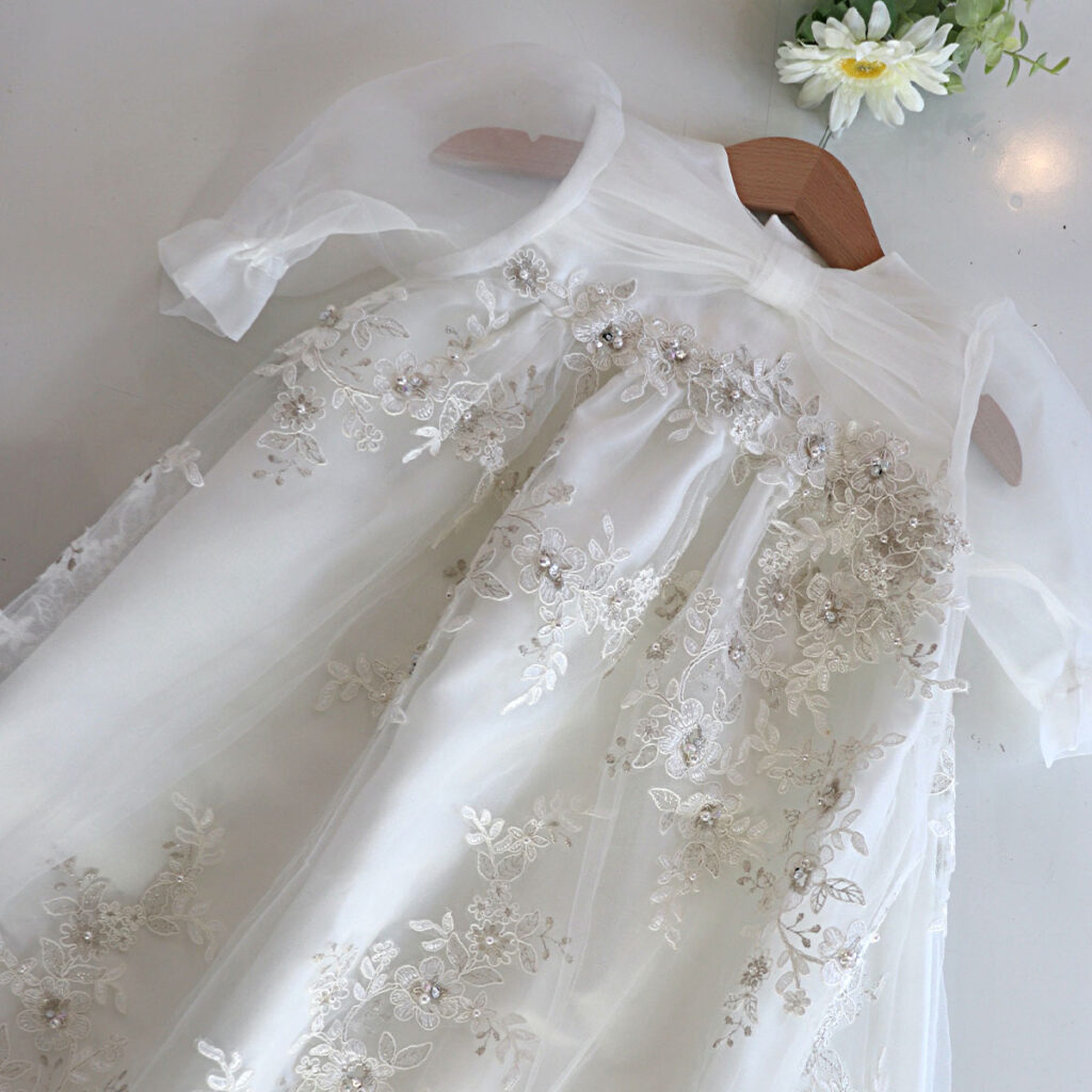 ウェディングドレスのボリューム感を活かし、オーガンジーやチュールを何層にも重ねたふんわりとしたドレス。まるでおとぎ話から飛び出してきたような、夢のあるデザインです。スカート部分の軽やかな素材は、お嬢様が動くたびにふわりと揺れ、天使のような愛らしさを演出します。元のドレスの生地を贅沢に使い、ボリュームたっぷりに仕上げることで、3歳から7歳という限られた年齢だからこそ似合う特別なシルエットを実現。ピアノの発表会やパーティーなど、華やかな場面で主役になれるドレスです。