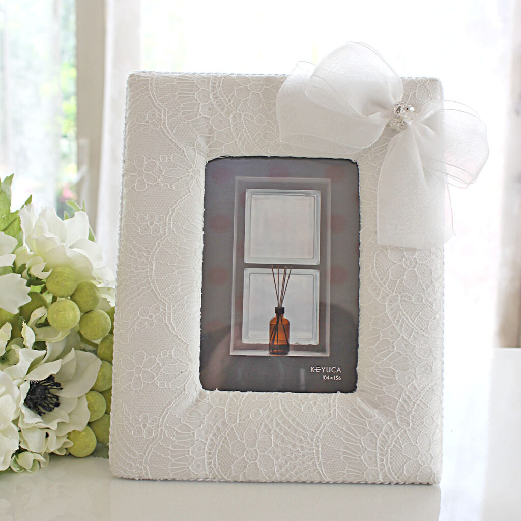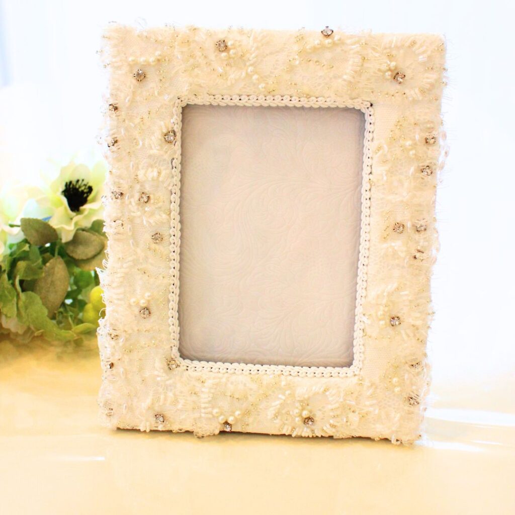 ドレスの素材を使った特別な写真フレームに、前撮り写真や二人の思い出の写真を入れて展示。またはフレームドレスにするのもとても可愛らしくて人気です。ゲストとの会話のきっかけにもなりますね。