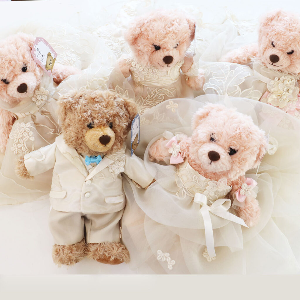 新郎新婦をかたどったウェルカムドールを、当日のドレス&タキシードで製作。受付を華やかに彩ります。
