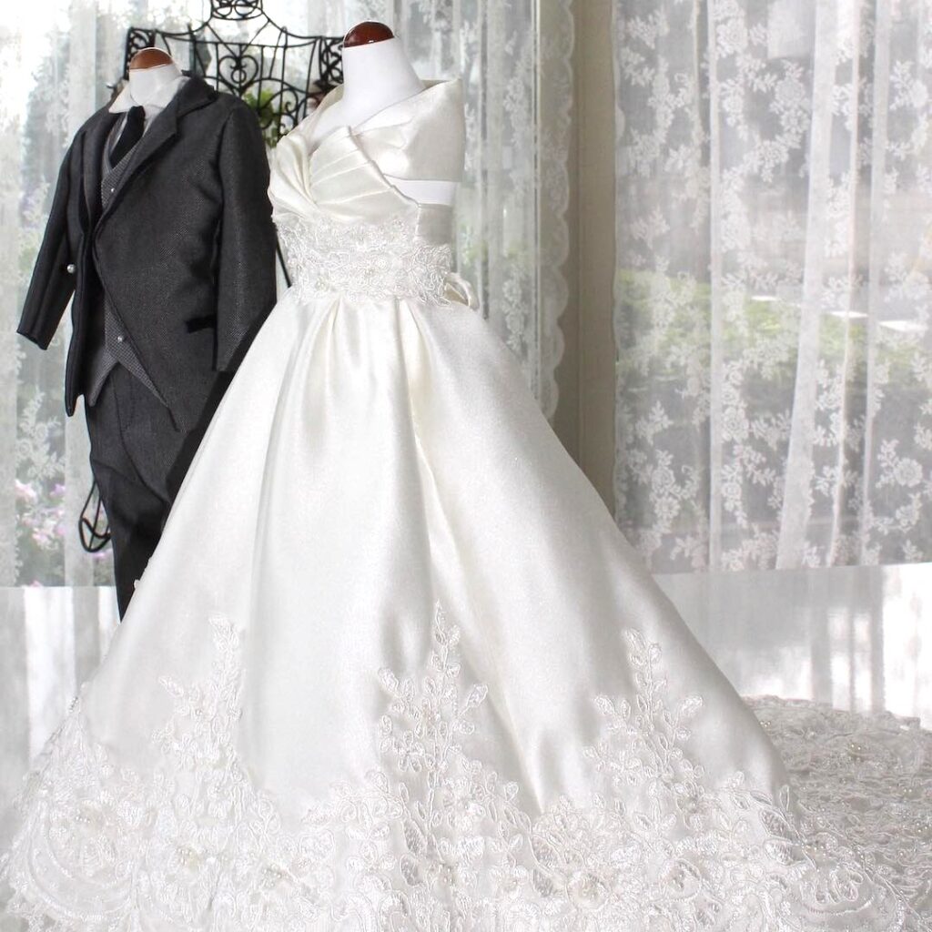 実は今、レンタルドレスでも記念品として形に残せるサービスが注目されています。結婚式の写真から、あなたが着たドレスのデザインを再現し、ミニチュアドレスや写真フレーム、ウェルカムドールとして残すことができるのです。