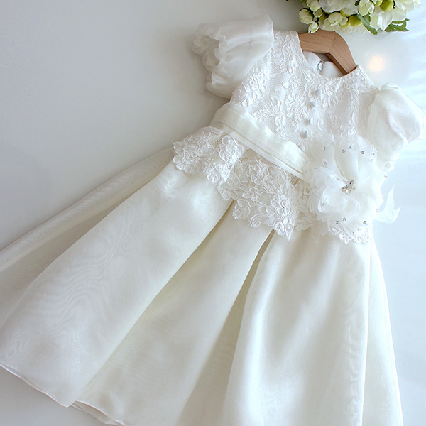 お宮参りや100日記念などの0歳児の撮影には、セレモニードレスの王道である純白のロングドレスがおすすめ。