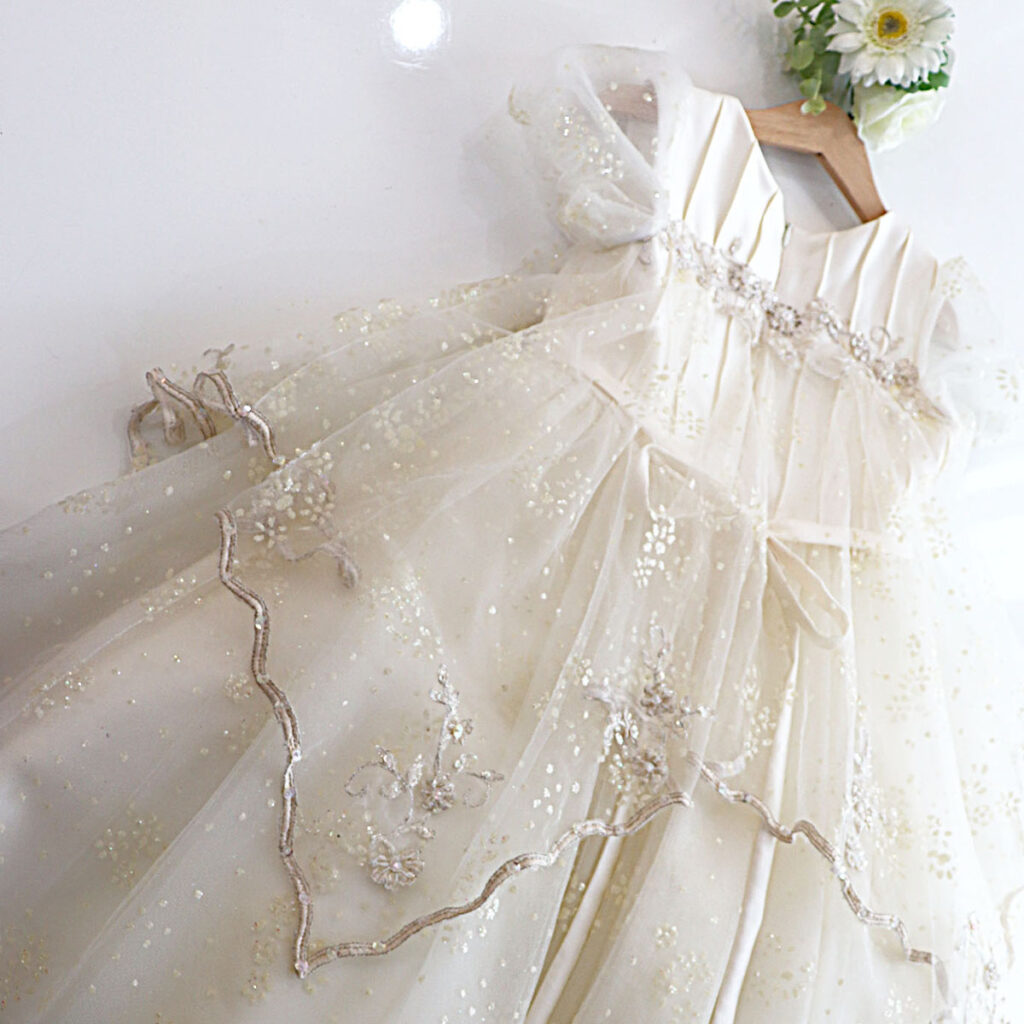 ピアノやバイオリンの発表会の撮影なら、舞台映えする華やかなビーズやスパンコールを取り入れたデザイン。