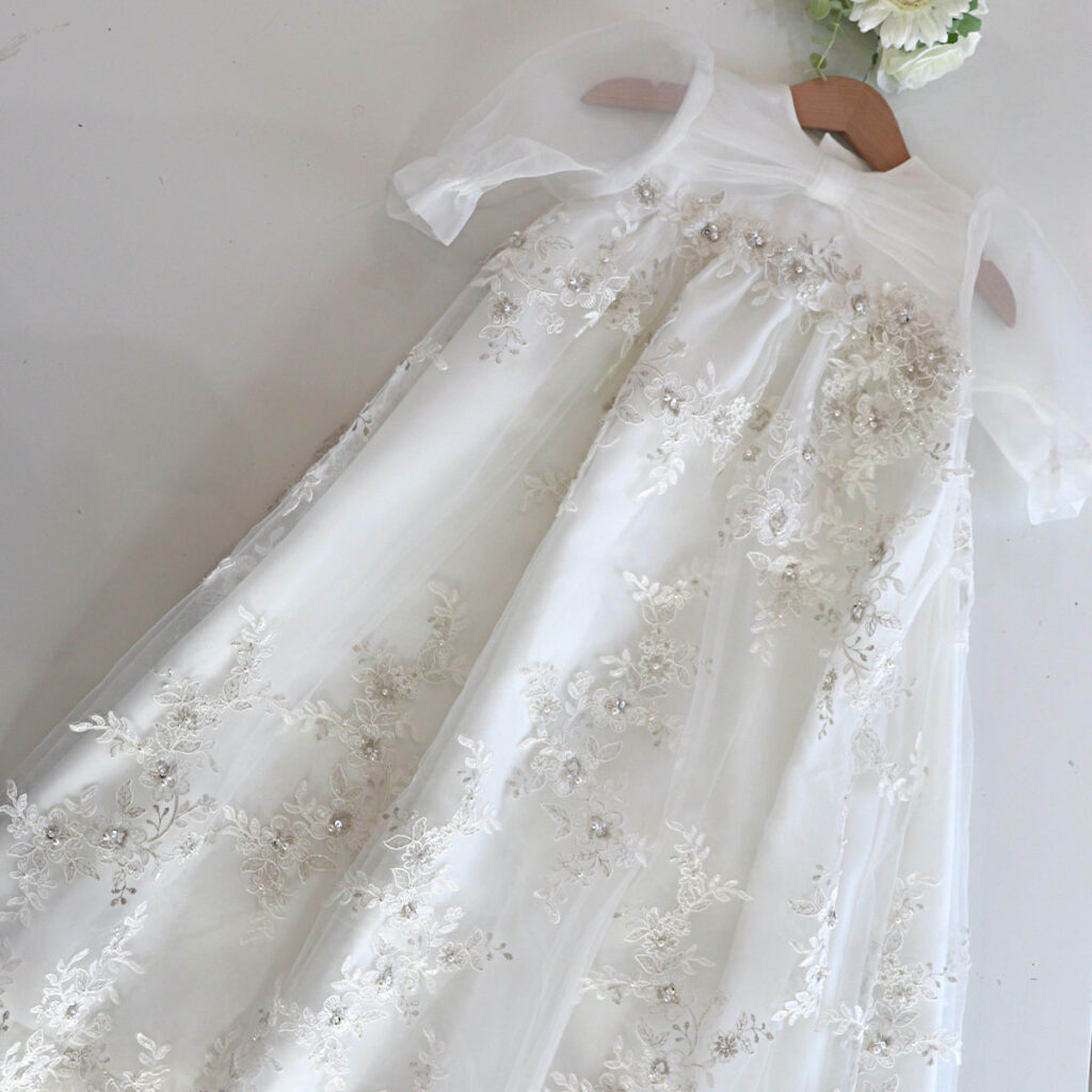 ウェディングドレスをリメイクしたベビードレスには、ママが結婚式で幸せな一日を過ごしたという特別なストーリーが込められています。
