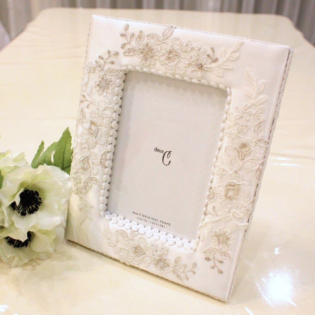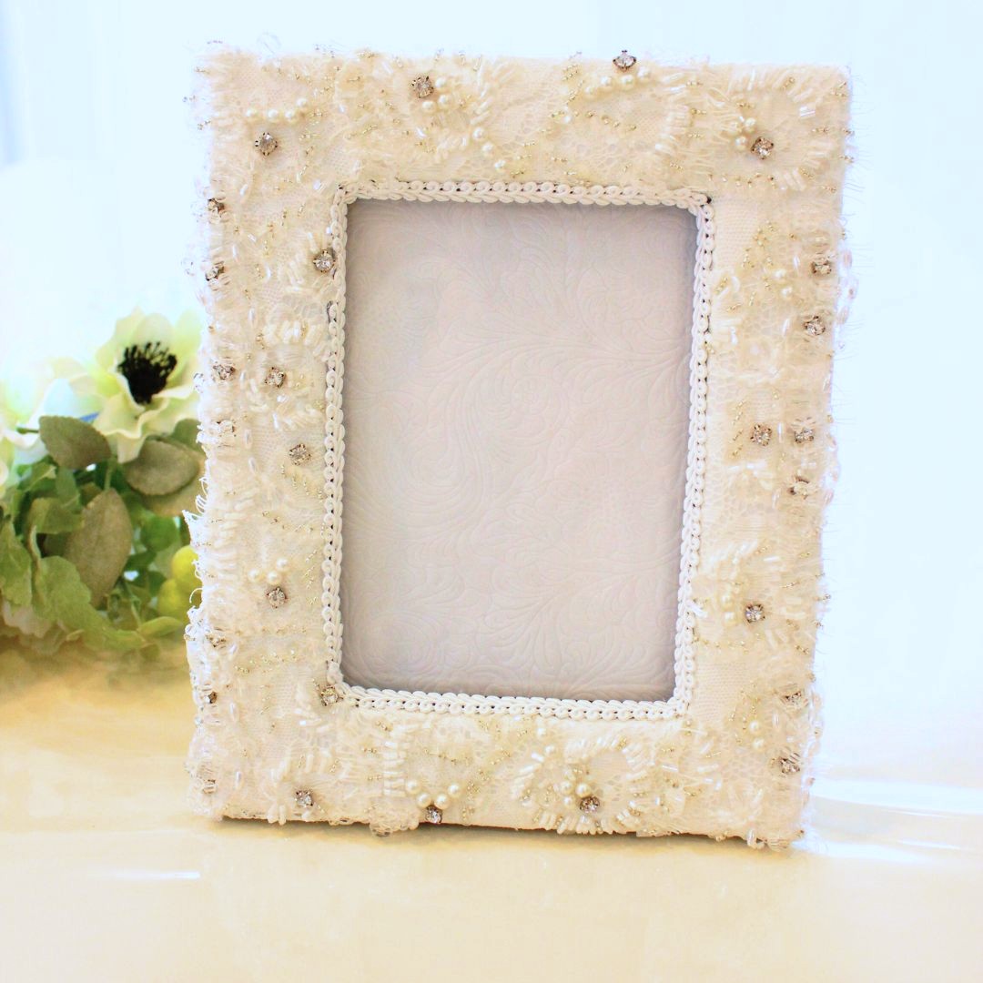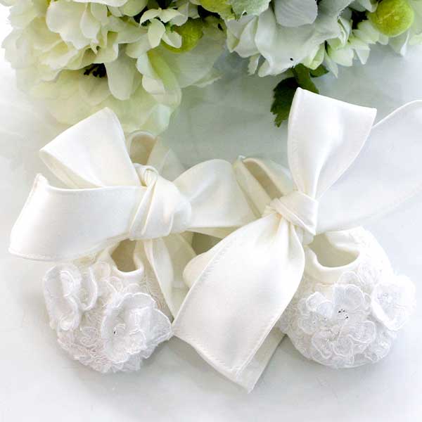 ウェディングドレスの装飾部分(レース、ビーズ、刺繍)を活かして作る、特別なファーストシューズ。実用性よりも記念品としての価値が高く、飾っておくだけでも素敵なインテリアになります。