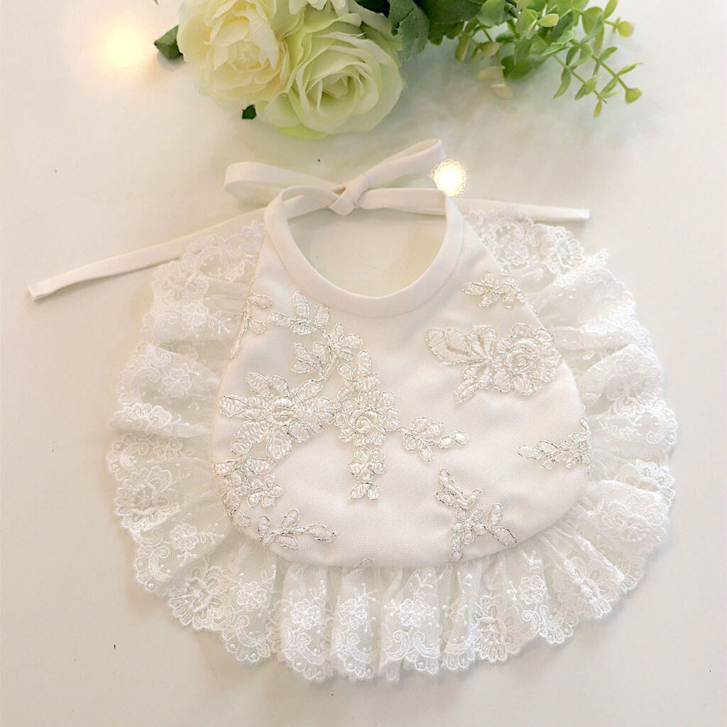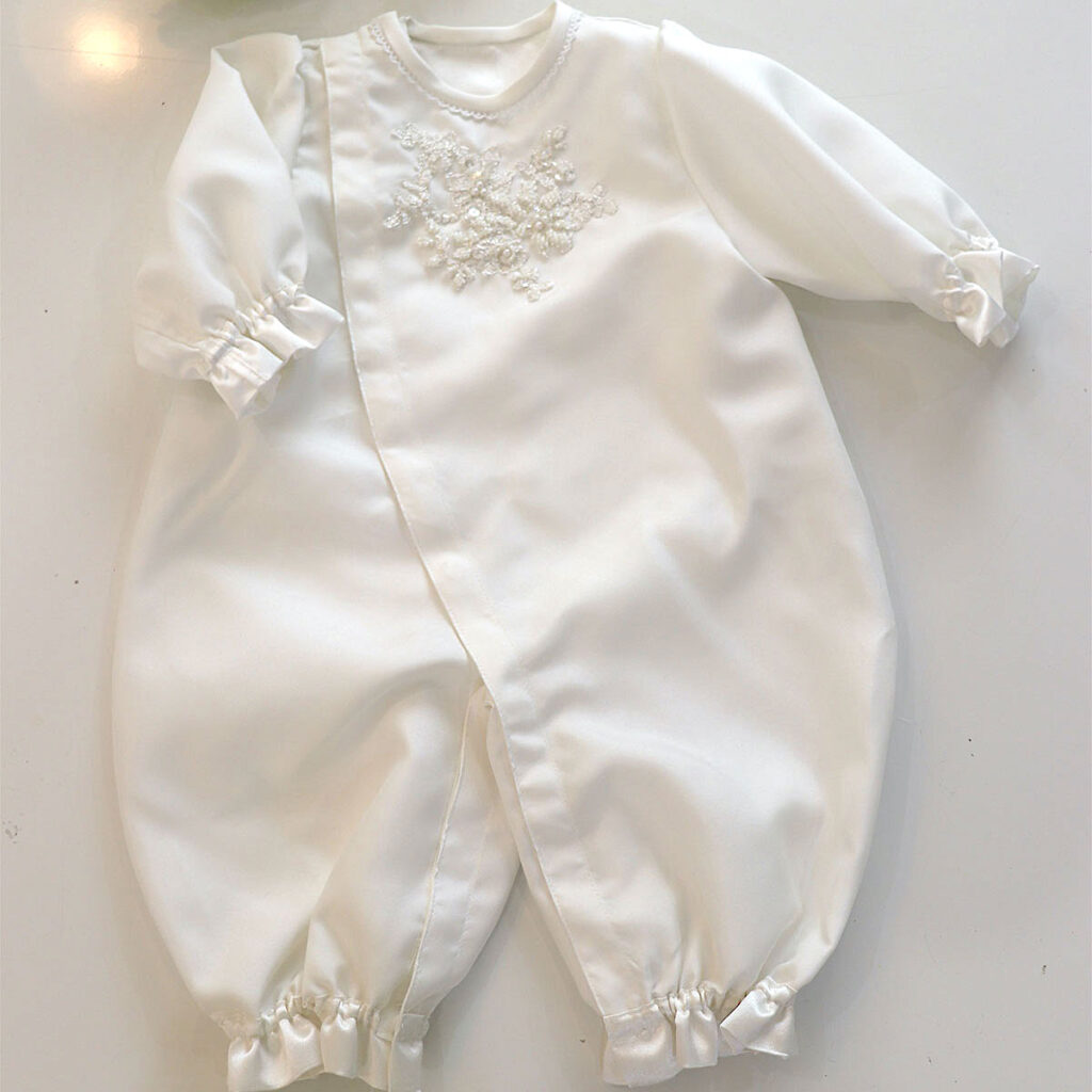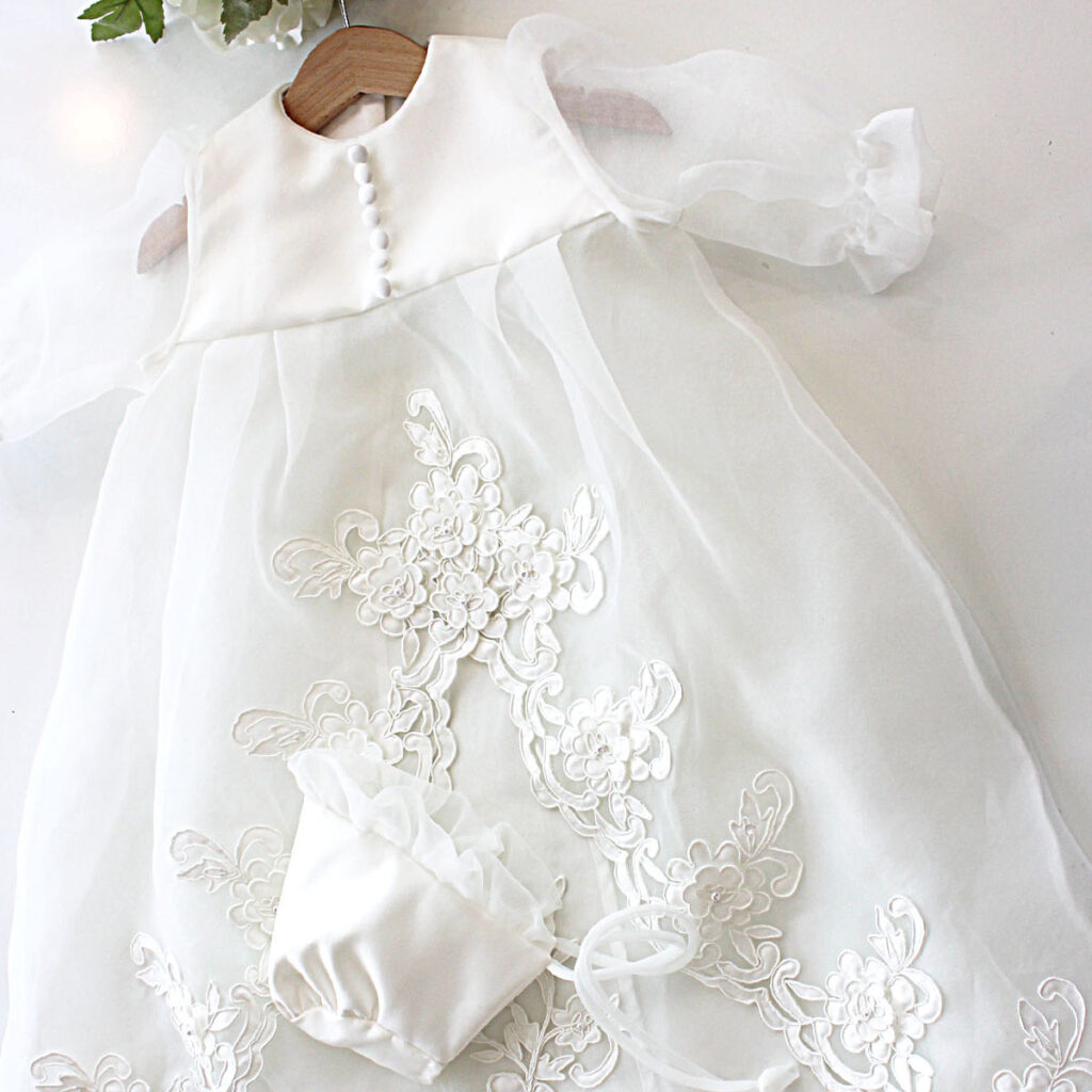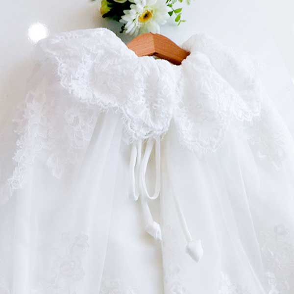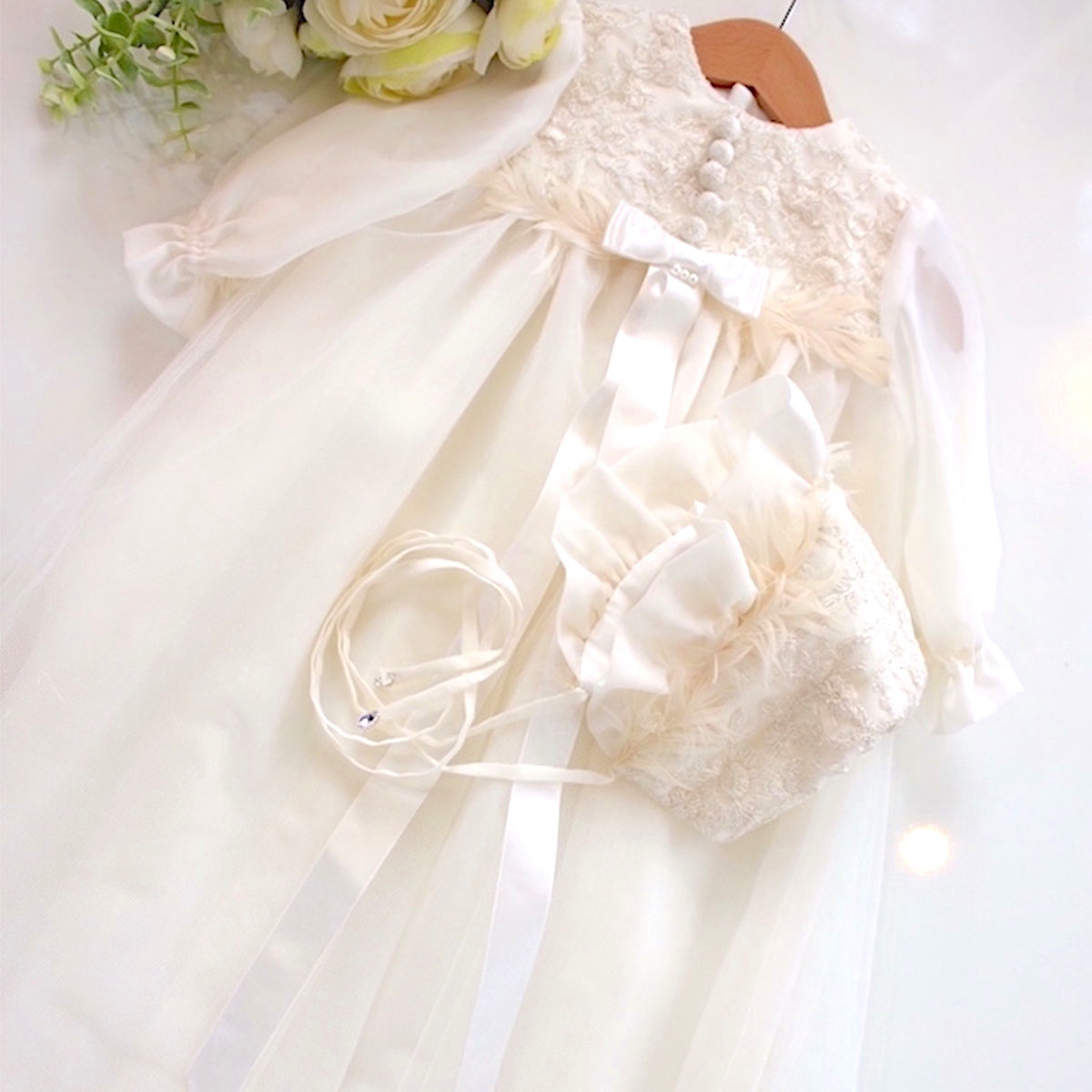 生後1ヶ月のお宮参りで着用する真っ白なベビードレス。ウェディングドレスのスカート部分を使い、ふんわりと優しいシルエットに。繊細なレース使いで、上品な印象に仕上がります。