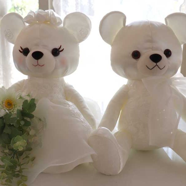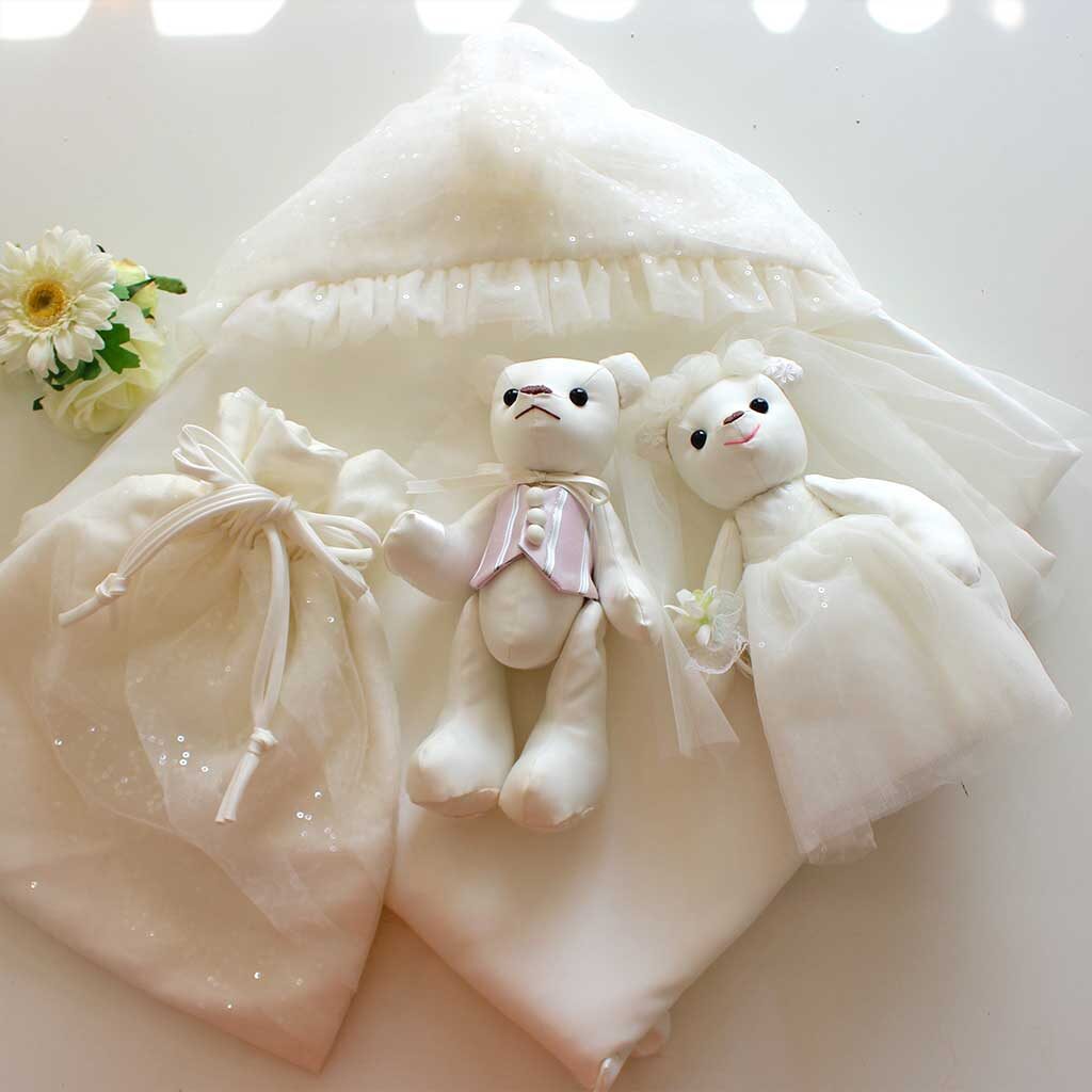 ドレスの生地で作るテディベアやうさぎのぬいぐるみ。抱っこしたり、一緒に眠ったり、成長してからも大切にできる思い出の品に。フォーマルウェアと一緒に制作すれば、残った生地も無駄なく活用できます。