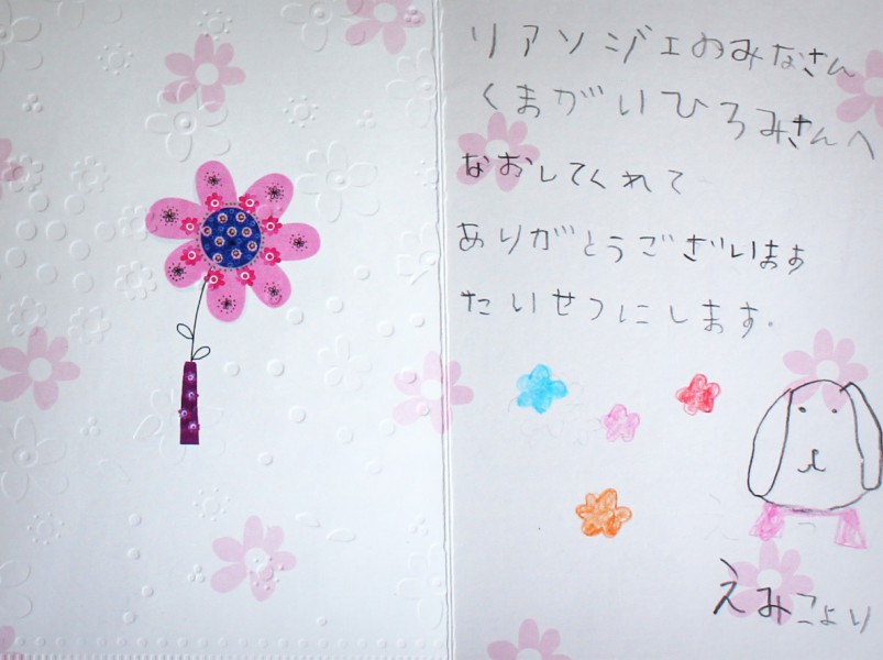 “ちいへ いつもえみのことをしんじてくれてありがとうね えみこより”